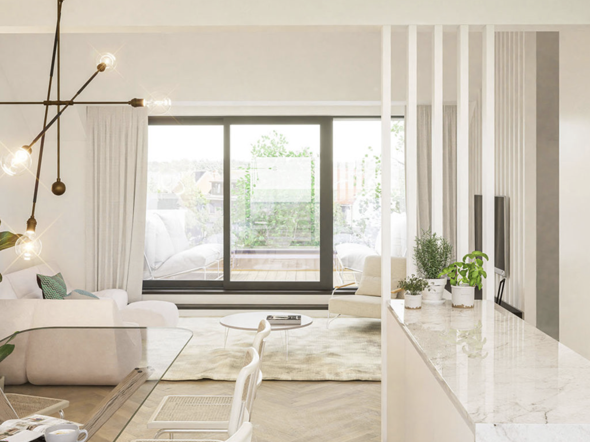 • Rez-de-chaussée : salon, cuisine américaine, salle à manger, escalier privatif vers l'étage, toilettes, buanderie, terrasse et jardinet.