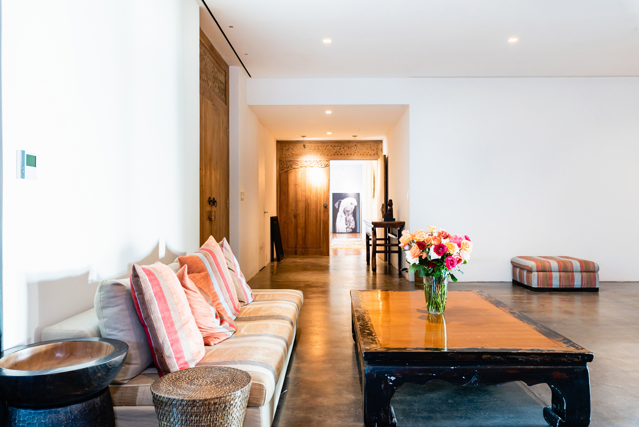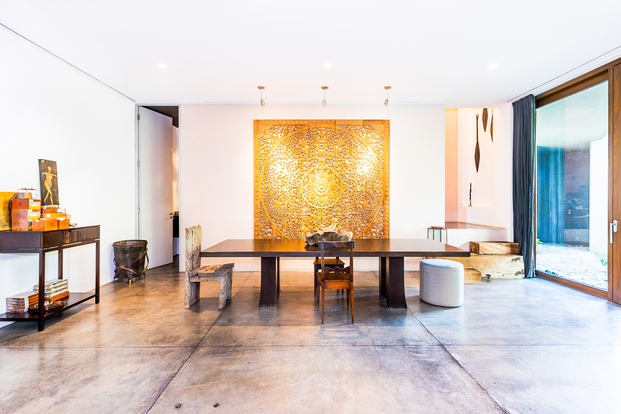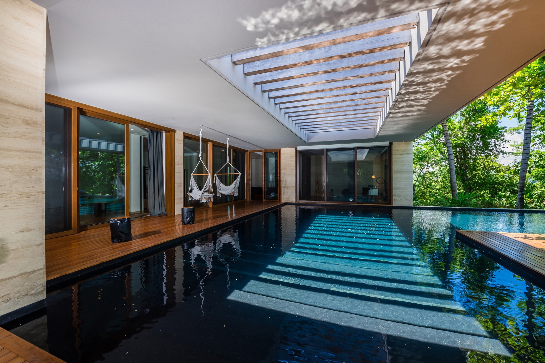 Les espaces extérieurs, élaborés selon les principes du feng shui, comprennent un jardin tropical, une véranda de piscine et une cheminée extérieure rustique. La suite principale offre une vue panoramique, tandis que la salle de bains principale est dotée d'une baignoire en granit sur mesure. Un appartement d'invités supplémentaire d'1 chambre avec cuisine complète l'ensemble.