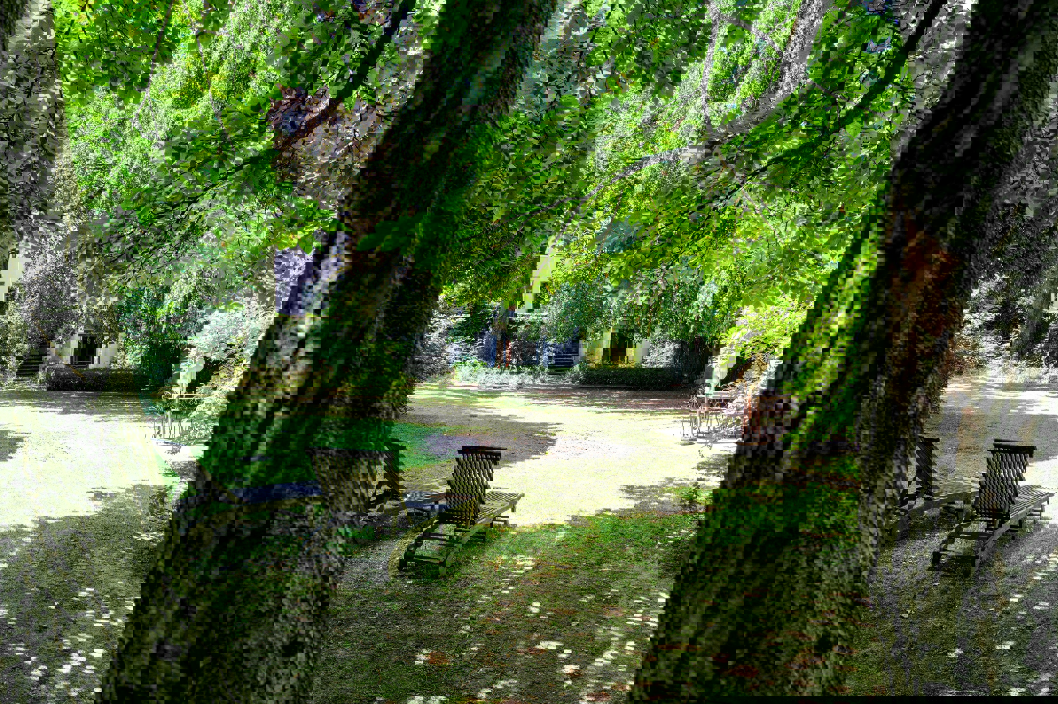 La partie arrière d'une superficie d'environ 850 m², dispose d’un hall d'entrée avec une somptueuse cage d'escalier, d’une cuisine avec coin à déjeuner, d’une salle à manger, d’un grand salon avec feu ouvert, quatre suites avec salles de bains et dressing, de divers espaces polyvalents et de belles terrasses donnant sur un parc.